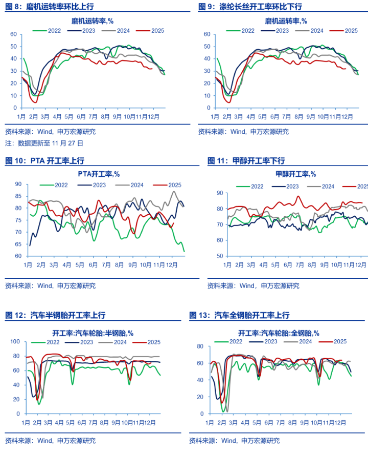 工业生产:生产表现较弱。从上游来看,本期全国电厂样本区域用煤量周度环比下行1.27%,石油沥青装置开工率周度环比上行0.10pcts至27.90%,高炉开工率周度环比下行1.10pcts至81.07%,粗钢产量周度环比下行6.43%。从地产链来看,螺纹钢开工率周度环比下行4.60pcts至37.36%,浮法玻璃开工率环比下行0.92pcts至73.70%,磨机运转率周度环比上行0.11pcts至31.94%。从泛消费品链来看,涤纶长丝开工率周度环比下行0.95pcts至90.31%,PTA开工率周度环比上行1.89pcts至73.81%,甲醇开工率周度环比下行0.27pcts至83.74%。从汽车链来看,汽车半钢胎开工率周度环比上行1.73pcts至70.92%,汽车全钢胎开工率周度环比上行0.17pcts至63.50%。