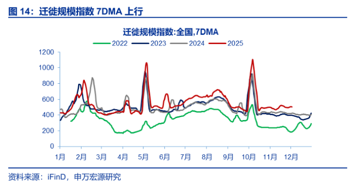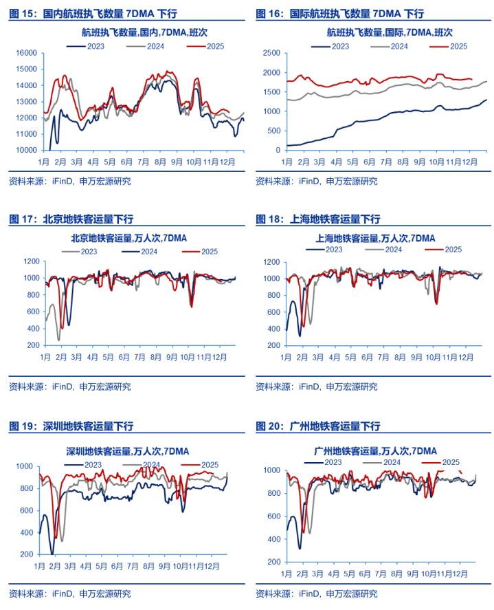 人流物流:人员流动延续上行,货运价格有所上行。人员流动上,本期全国迁徙规模指数7DMA周度环比上行1.67%。本期国内航班执飞数量7DMA环比下行1.11%,国际航班执飞数量7DMA周度环比下行1.03%;本周北京,上海,深圳和广州地铁客运量均下行。货运流量上,公路物流运价指数4WMA周度环比上行0.07%,总量高于去年同期水平。